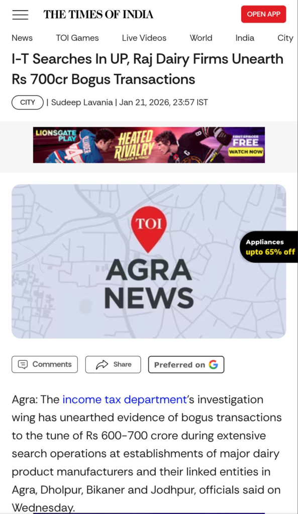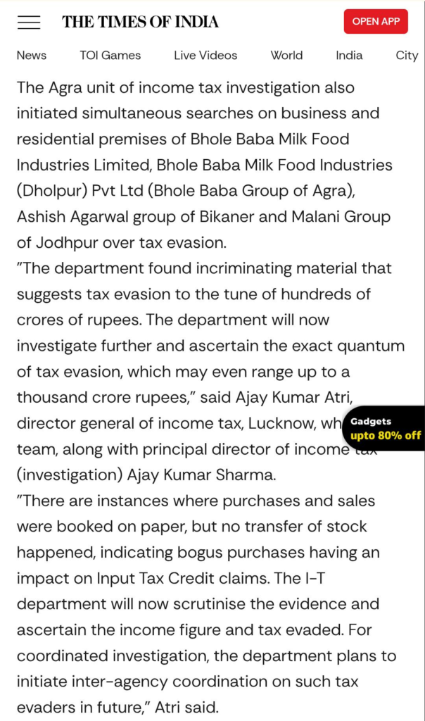 2026 జనవరి 21న భోలే బాబా డైరీ గ్రూప్పై ఆదాయపు పన్ను శాఖ సోదాలు నిర్వహించింది. ఈ సోదాల్లో సుమారు ₹700 కోట్ల బోగస్ లావాదేవీలు జరిగినట్లు అనుమానాలు వ్యక్తమయ్యాయి. అధికారులు కొన్ని ఉత్పత్తుల నమూనాలను కూడా సేకరించినట్టు సమాచారం.