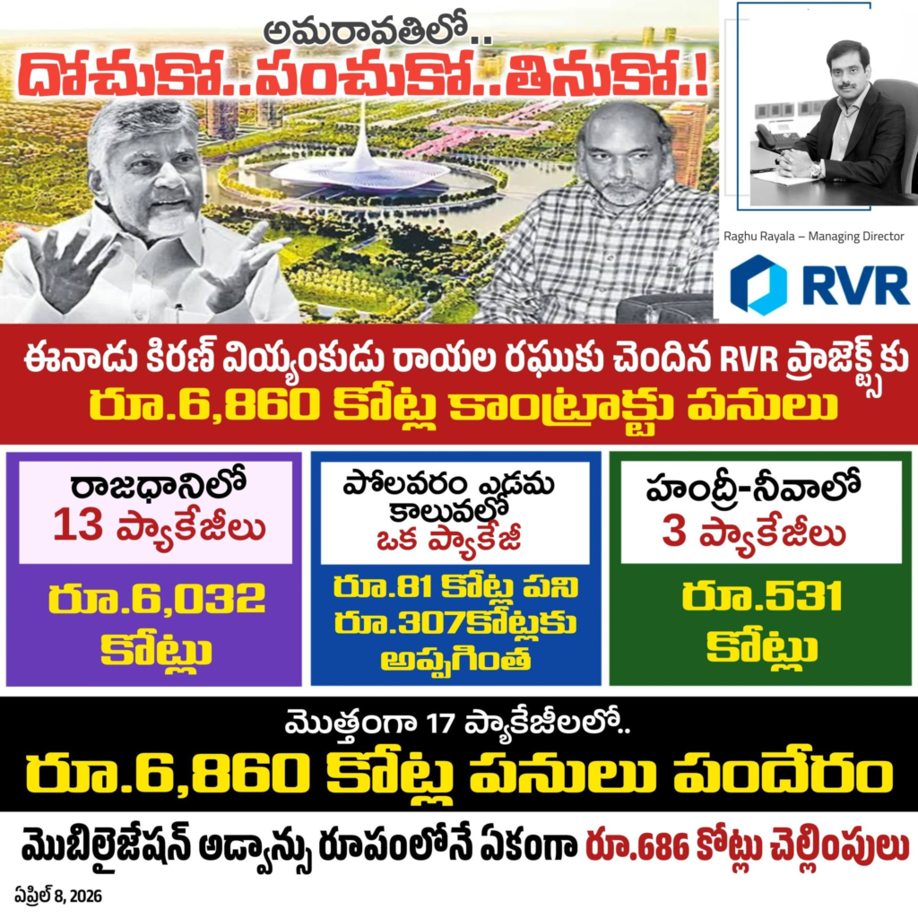 - ఈనాడు కిరణ్ వియ్యంకుడు రాయల రఘుకు చెందిన RVR ప్రాజెక్ట్స్కు రూ.6,860 కోట్ల పనులు అప్పగింత