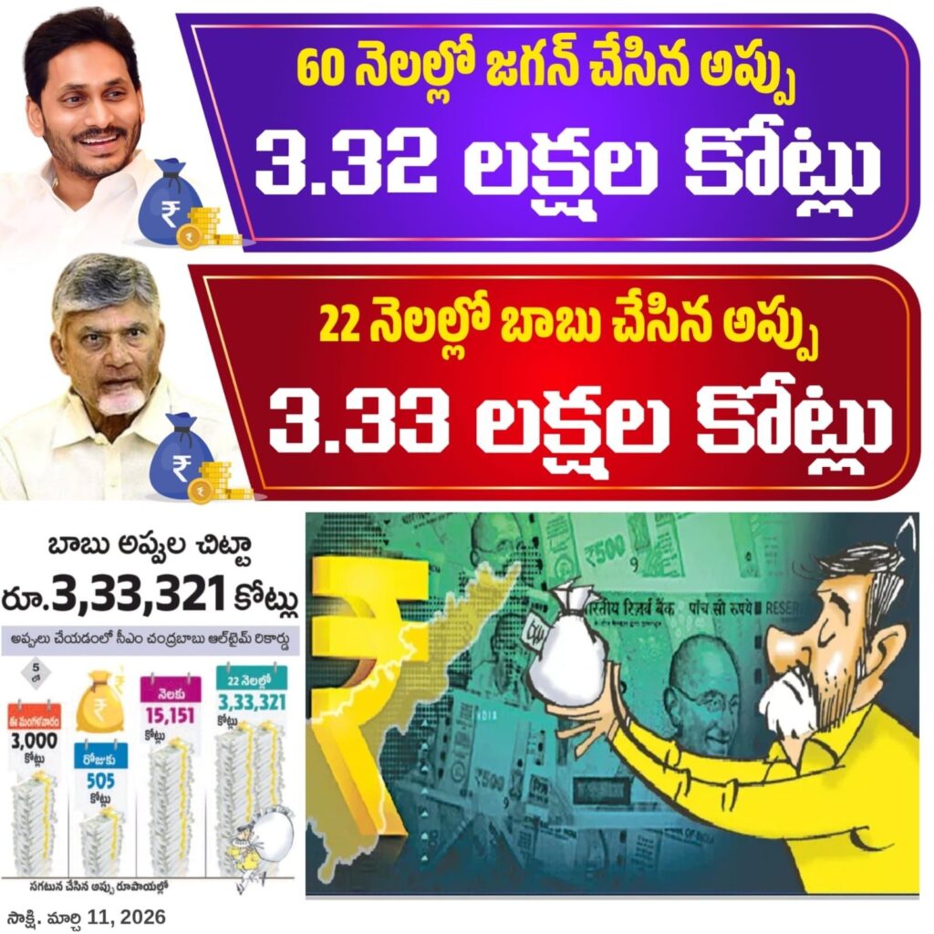 ఆంధ్రప్రదేశ్లో ప్రభుత్వ అప్పుల అంశం మరోసారి రాజకీయ చర్చకు దారి తీస్తోంది. గత ప్రభుత్వం మరియు ప్రస్తుత ప్రభుత్వం తీసుకున్న అప్పులపై వాదనలు కొనసాగుతున్నాయి. గణాంకాల ప్రకారం వైఎస్ జగన్ మోహన్ రెడ్డి ప్రభుత్వం 60 నెలల కాలంలో రూ.3.32 లక్షల కోట్లు అప్పు చేయగా, సీఎం చంద్రబాబు నాయుడు ప్రభుత్వం కేవలం 22 నెలల్లోనే రూ.3.33 లక్షల కోట్లు అప్పు చేసినట్లు ఆరోపణలు వినిపిస్తున్నాయి.
