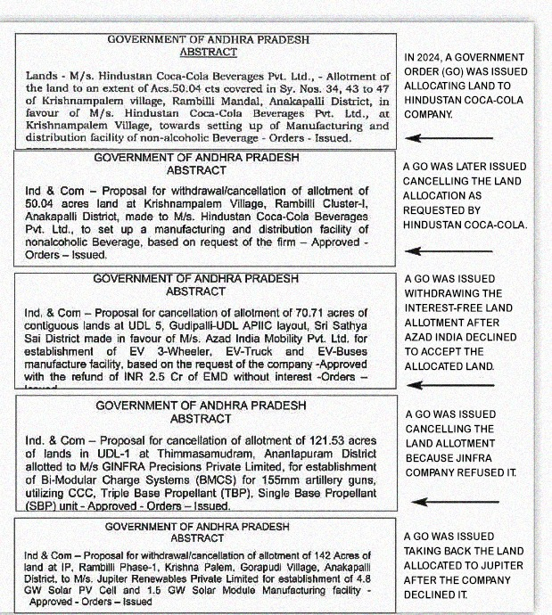 అనకాపల్లి జిల్లాలో 142 ఎకరాలపై ₹2,700 కోట్ల సోలార్ తయారీ యూనిట్ ఏర్పాటు చేయడానికి అనుమతి ఇచ్చినా, అమలు ప్రారంభం కాకముందే కంపెనీ ప్రాజెక్టును ఉపసంహరించుకుంది.