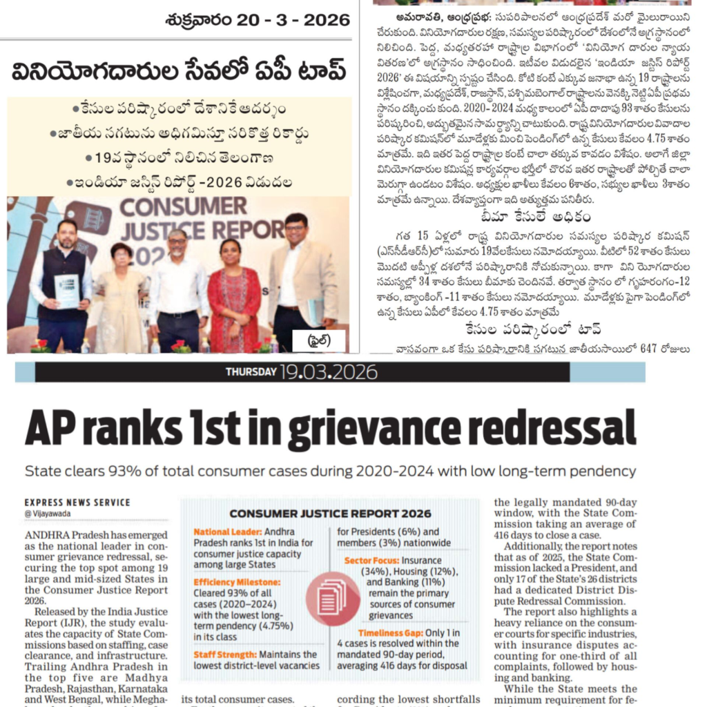 అమరావతి: 2020-2024 మధ్య ముఖ్యమంత్రి వైఎస్ జగన్ మోహన్ రెడ్డి పాలనలో ఆంధ్రప్రదేశ్ వినియోగదారుల సమస్యల పరిష్కారంలో దేశంలోనే అగ్రస్థానాన్ని సాధించింది. ఇండియా జస్టిస్ రిపోర్ట్ 2026 ఈ విషయాన్ని స్పష్టం చేసింది.