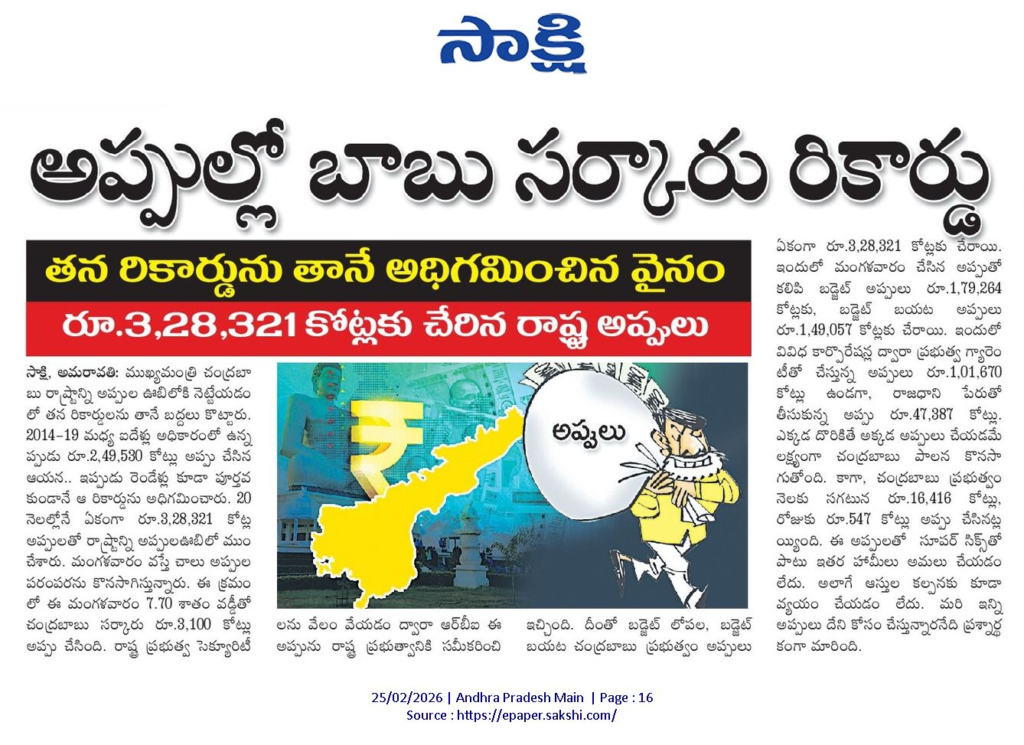 ఈ ఆర్థిక సంవత్సరంలోనే ఇప్పటికే రూ.1,79,668 కోట్లు అప్పుగా తీసుకోగా, గత మేలో Y. S. Jagan Mohan Reddy ప్రభుత్వం నుంచి వచ్చిన అప్పు రూ.1,48,557 కోట్లు. ప్రభుత్వం గ్యారంటీ ఇచ్చిన అప్పులు రూ.1,01,170 కోట్లు ఉండగా, మార్కెట్ ద్వారా రూ.47,387 కోట్లు సమీకరించింది. కేంద్ర సహాయం కలిపి మొత్తం అప్పు రూ.3,28,225 కోట్లకు చేరింది. చేసిన అప్పులపై వడ్డీ చెల్లింపులు రాష్ట్ర ఖజానాపై భారీ భారంగా మారుతున్నాయి.