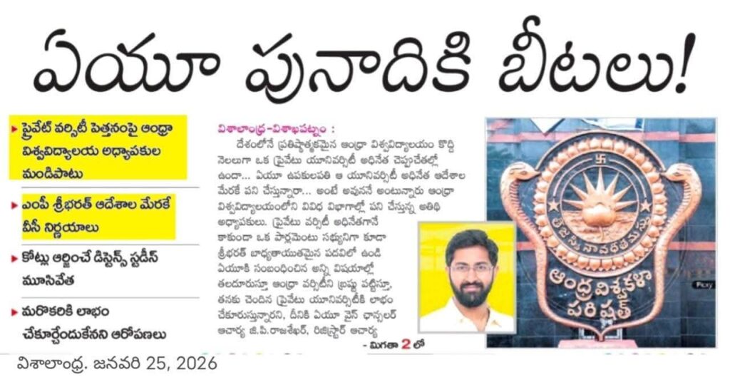 ప్రైవేటు యూనివర్సిటీ అధినేతగా మాత్రమే కాకుండా, విశాఖపట్నం పార్లమెంటు సభ్యుడిగా ఉన్న శ్రీభరత్ ఆదేశాల మేరకే ఆంధ్రా విశ్వవిద్యాలయ Vice Chancellor కీలక నిర్ణయాలు తీసుకుంటున్నారని Guest lecturers ఆరోపిస్తున్నారు.