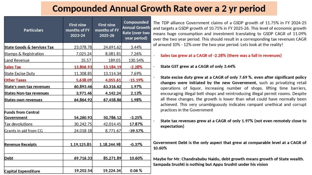 కేంద్ర కాగ్ నివేదికలో వెల్లడైన గణాంకాల ఆధారంగా, ఆంధ్రప్రదేశ్ రాష్ట్రంలో గత మరియు ప్రస్తుత పాలనల మధ్య ఉన్న రెవెన్యూ లోటు, ద్రవ్య లోటు, అప్పుల స్థాయి మరియు పన్ను ఆదాయాల వృద్ధిలోని స్పష్టమైన తేడాలను ఈ విశ్లేషణ సమగ్రంగా వివరిస్తుంది. రాష్ట్ర ఆర్థిక దిశపై గంభీరమైన సూచనలను ఈ సంఖ్యలు ప్రతిబింబిస్తున్నాయి.