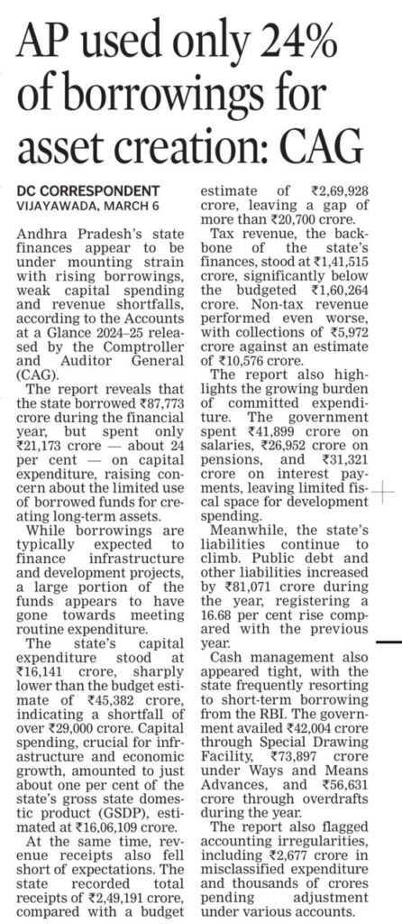 - అప్పులు పెరుగుతున్నా అభివృద్ధి ఖర్చు తగ్గడం ఆర్థిక క్రమశిక్షణపై సందేహాలు కలిగిస్తున్నదని నివేదిక పేర్కొంది.