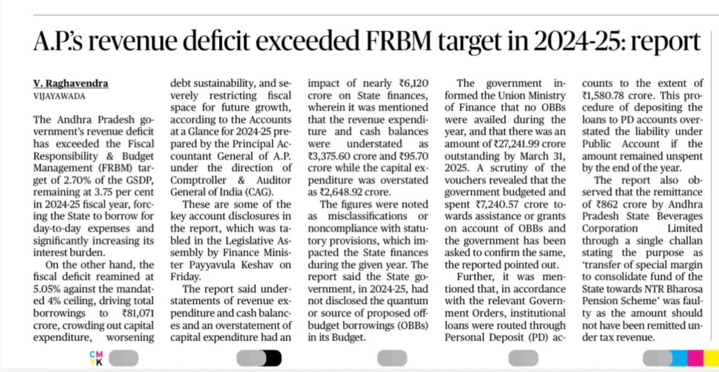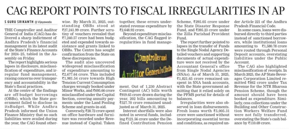 ఆంధ్రప్రదేశ్ రాష్ట్ర ఆర్థిక పరిస్థితిపై Comptroller and Auditor General of India (CAG) విడుదల చేసిన తాజా నివేదికలో అనేక ఆందోళనకర అంశాలు వెలుగులోకి వచ్చాయి. 2024-25 ఆర్థిక సంవత్సరంలో రాష్ట్ర ఆదాయ లోటు Fiscal Responsibility and Budget Management Act (FRBM) చట్టం నిర్దేశించిన పరిమితిని మించి వెళ్లిందని నివేదిక తెలిపింది. భారీగా అప్పులు తీసుకున్నప్పటికీ వాటిలో చాలా తక్కువ భాగమే అభివృద్ధి కార్యక్రమాలకు వినియోగించబడినట్లు వెల్లడైంది. ఈ నివేదికను ఆంధ్రప్రదేశ్ శాసనసభలో ఆర్థిక మంత్రి Payyavula Keshav ప్రవేశపెట్టారు.