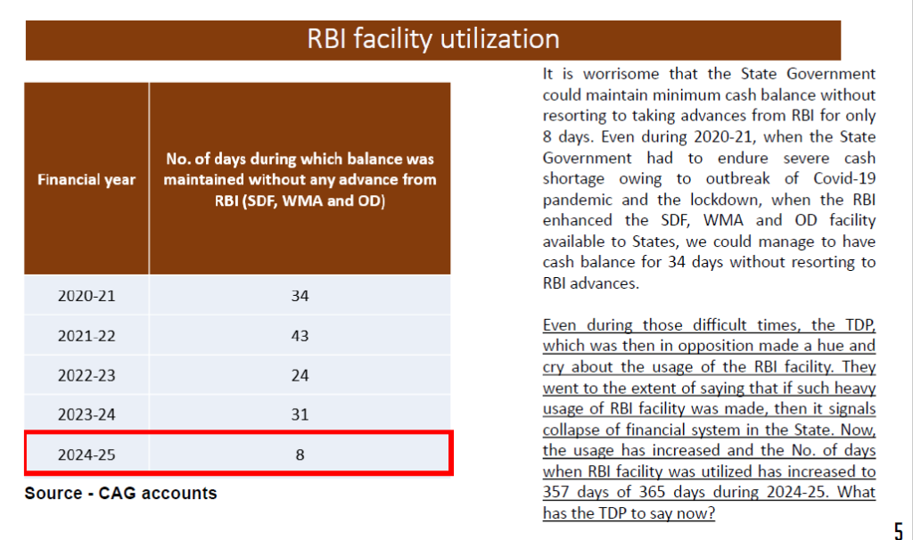 2024-25 సంవత్సరంలో మొత్తం 365 రోజుల్లో 357 రోజులు RBI సౌకర్యాలను రాష్ట్ర ప్రభుత్వం ఉపయోగించింది. అంటే ఖజానాలో స్వంత నగదు నిల్వల కంటే, RBI తాత్కాలిక అడ్వాన్స్‌లపై ఆధారపడుతున్న పరిస్థితి స్పష్టంగా కనిపిస్తోంది.