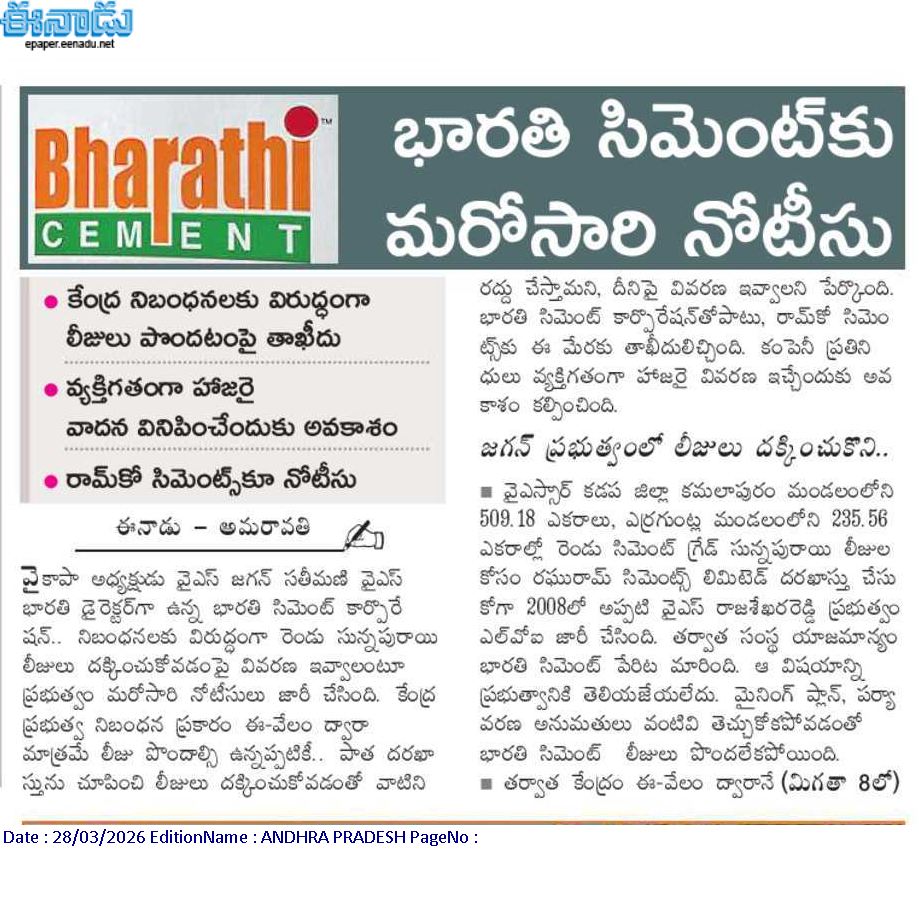- భారతి సిమెంట్స్కు సున్నపురాయి లీజులపై నోటీసులు