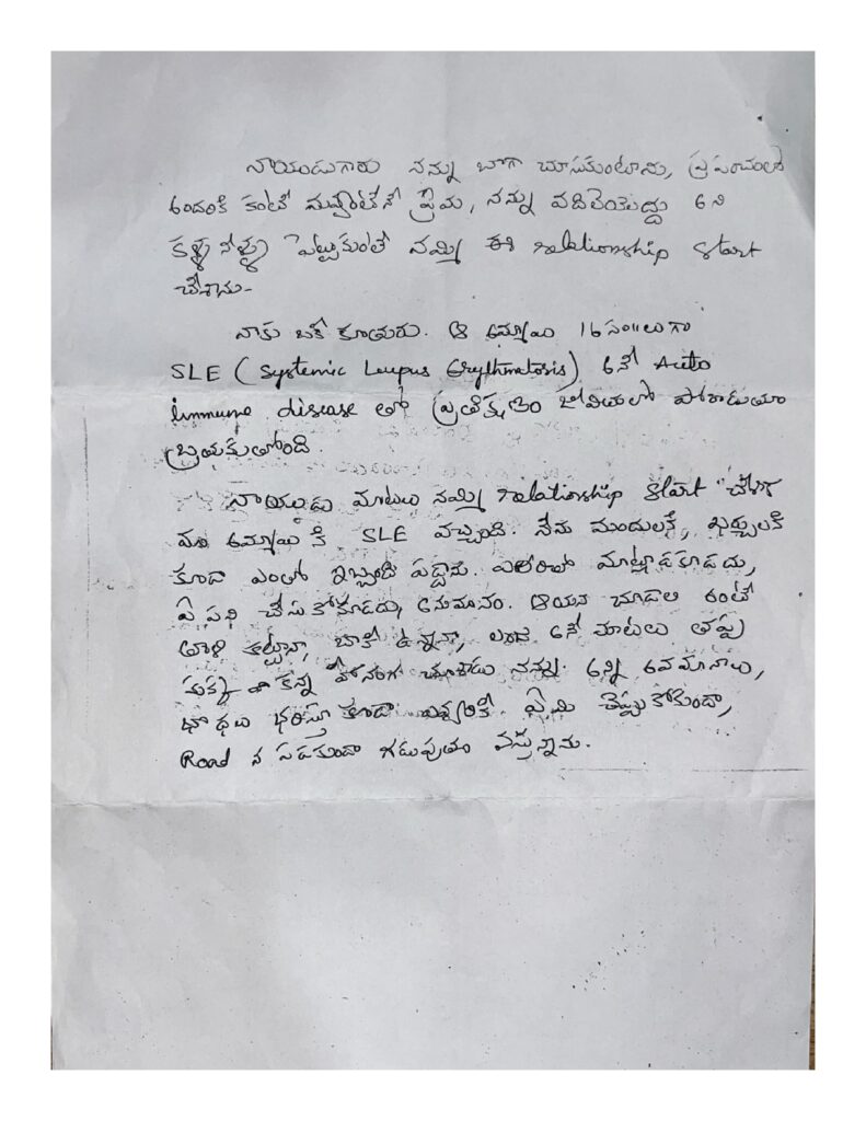 రెండో పేజీలో తన ఆరోగ్య పరిస్థితి (SLE – ఇమ్యూన్ సంబంధిత వ్యాధి) గురించి ప్రస్తావిస్తూ, ఆ సమయంలో తాను తీవ్ర మానసిక ఒత్తిడిని ఎదుర్కొన్నట్లు పేర్కొన్నారు.