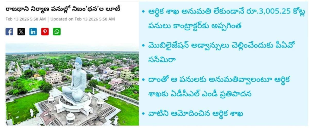 రాజధాని నిర్మాణ పనుల్లో ఆర్థిక నియమాలు, విధివిధానాలు పాటించబడ్డాయా అన్న సందేహాలు మళ్లీ తెరపైకి వచ్చాయి. ముందస్తు ఆర్థిక అనుమతి లేకుండానే వేల కోట్ల రూపాయల పనులు అప్పగించబడటం, అనంతరం అనుమతులు పొందడం వంటి చర్యలు పరిపాలనా పారదర్శకతపై ప్రశ్నలు లేవనెత్తుతున్నాయి.
