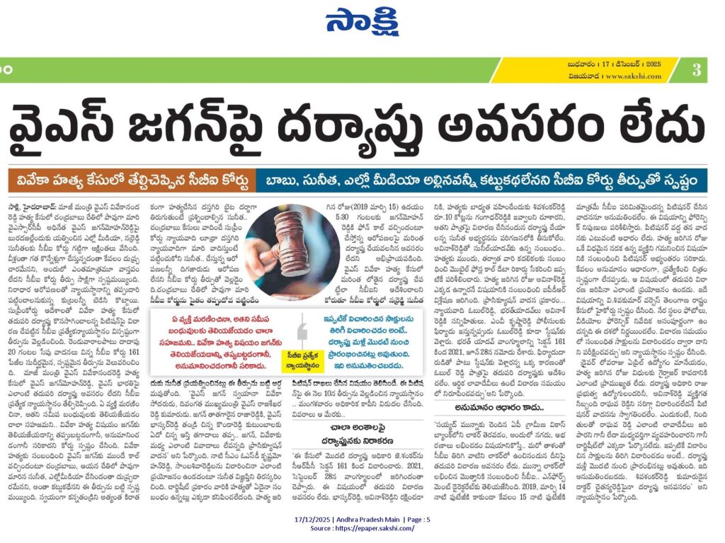 వివేకా హత్య కేసులో వైఎస్ జగన్పై దర్యాప్తు అవసరం లేదని సీబీఐ కోర్టు స్పష్టంగా తేల్చింది. ఒక వ్యక్తి మరణించినప్పుడు సమీప బంధువులకు సమాచారం ఇవ్వడం సహజమని కోర్టు వ్యాఖ్యానించింది. అయినప్పటికీ ఈ అంశాన్ని వక్రీకరిస్తూ రాజకీయ ఆరోపణలు కొనసాగుతున్నాయి.