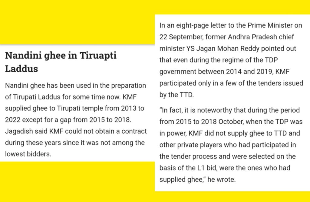టీటీడీకి ఎన్నేళ్లుగా నెయ్యి సరఫరా చేసిన కర్ణాటక ప్రభుత్వ నందిని డైరీని పక్కనపెట్టి, ప్రైవేట్ డైరీలకు టెండర్లు కట్టబెట్టినది చంద్రబాబు పాలనలోనే. కమీషన్ల కోసమే ఈ సిండికేట్కు బీజం వేసారన్న ఆరోపణలకు ఇవే ఆధారాలు.