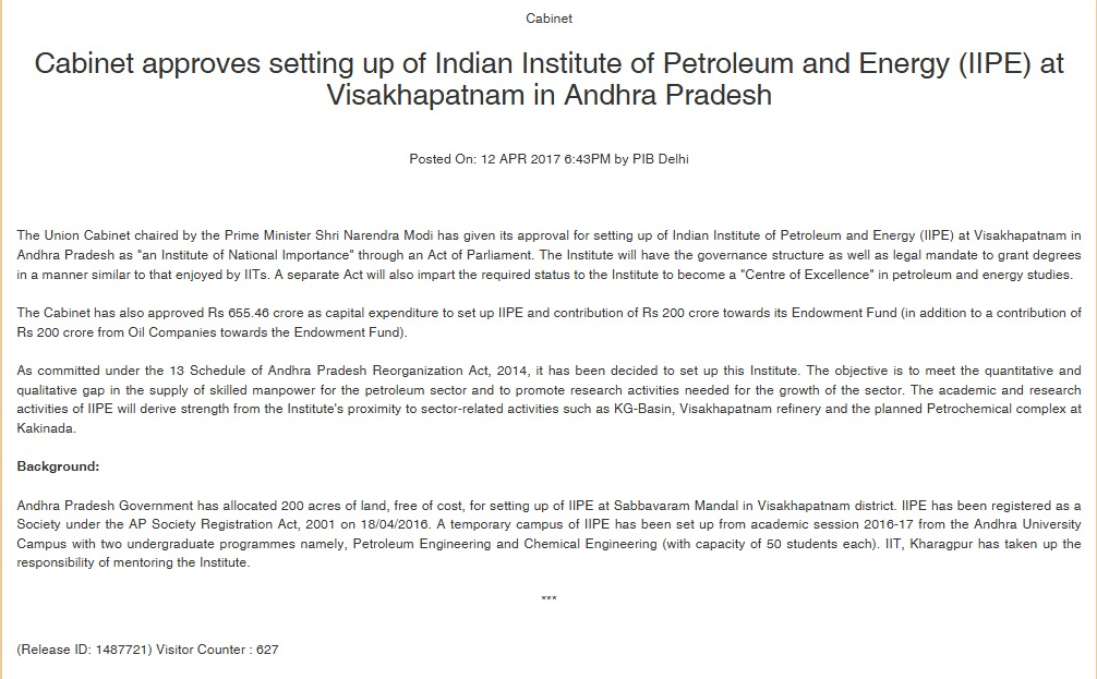 Cabinet approves setting up of Indian Institute of Petroleum and Energy (IIPE) at Visakhapatnam in Andhra Pradesh