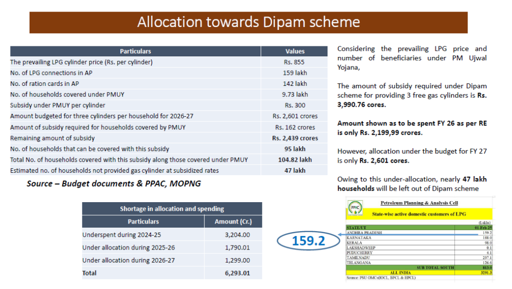 ఆంధ్రప్రదేశ్‌లో మహిళలకు ఉచిత గ్యాస్ సిలిండర్లు అందించాలనే లక్ష్యంతో ప్రకటించిన దీపం పథకం అమలుపై కొత్త ప్రశ్నలు తలెత్తుతున్నాయి. ప్రస్తుత LPG ధరలు, PM ఉజ్వల యోజన (PMUY) కింద ఉన్న లబ్ధిదారుల సంఖ్య, అలాగే బడ్జెట్ కేటాయింపులను పరిశీలిస్తే ఈ పథకానికి అవసరమైన మొత్తం నిధులు కేటాయించబడలేదనే విషయం స్పష్టమవుతోంది.