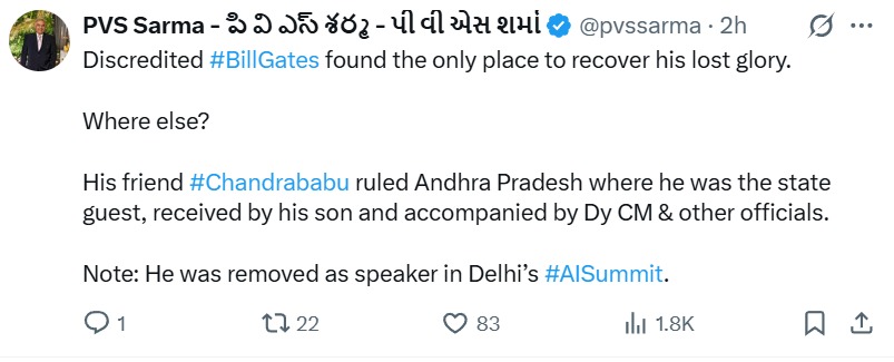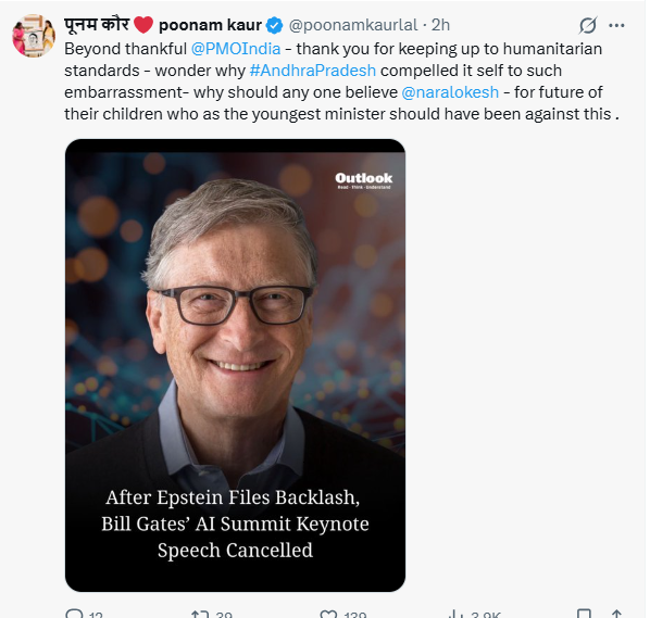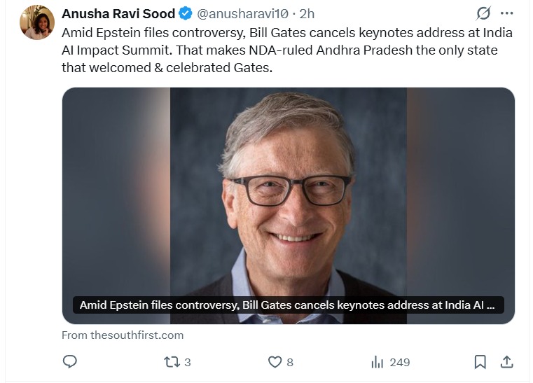 సోషల్ మీడియా వేదికగా పలువురు జర్నలిస్టులు, ప్రజా ప్రతినిధులు మరియు రాజకీయ విశ్లేషకులు ఈ అంశంపై సందేహాలు వ్యక్తం చేస్తున్నారు. Epstein files వివాదం ముదురుతున్న సమయంలో ఢిల్లీ సమ్మిట్ నుంచి గేట్స్ తప్పుకున్నారని చెబుతుండగా, అదే సమయంలో ఆంధ్రప్రదేశ్ రాష్ట్ర ముఖ్యమంత్రి చంద్రబాబు నాయుడు Bill Gates ను అతిథిగా ఆహ్వానించడం సరైన నిర్ణయమా అనే ప్రశ్నలు లేవనెత్తుతున్నారు.