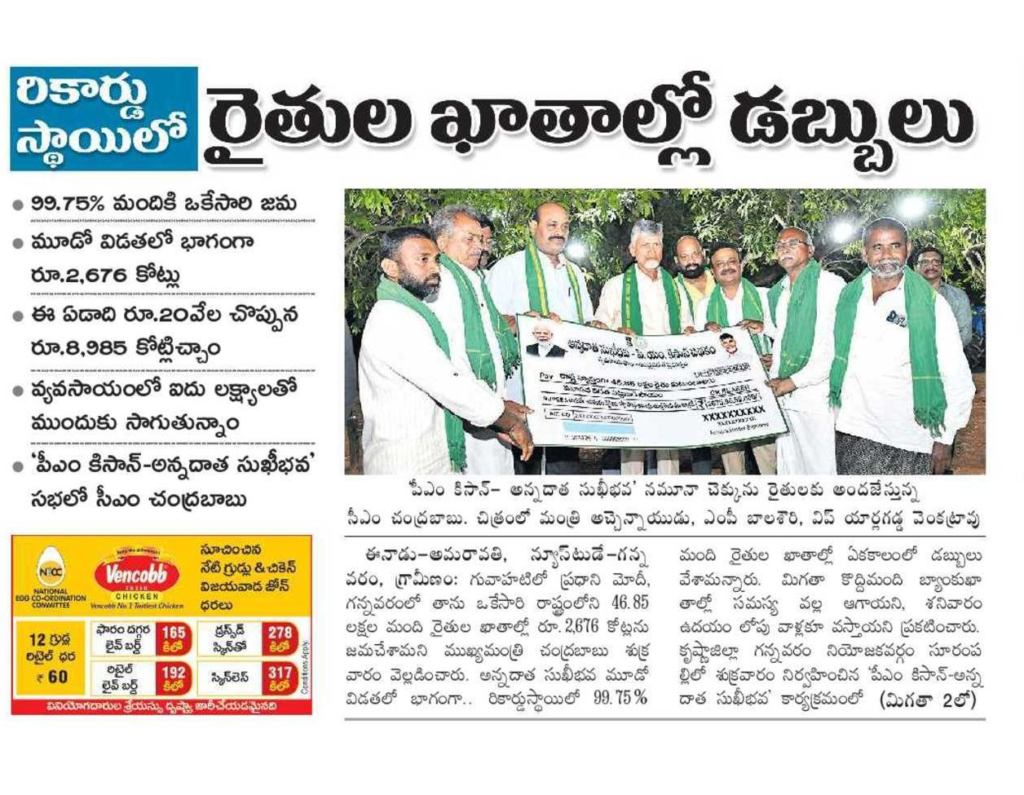 రాష్ట్ర ప్రభుత్వం “పీఎం కిసాన్–అన్నదాత సుఖీభవ” పేరుతో రైతుల ఖాతాల్లో వేల కోట్లు జమ చేశామని భారీ ప్రచారం చేస్తోంది. 46.85 లక్షల మంది రైతులకు రూ.2,676 కోట్లు జమ చేశామని, 99.75% మంది రైతులకు ఒకేసారి డబ్బులు చేరాయని సీఎం చంద్రబాబు ప్రకటించారు.