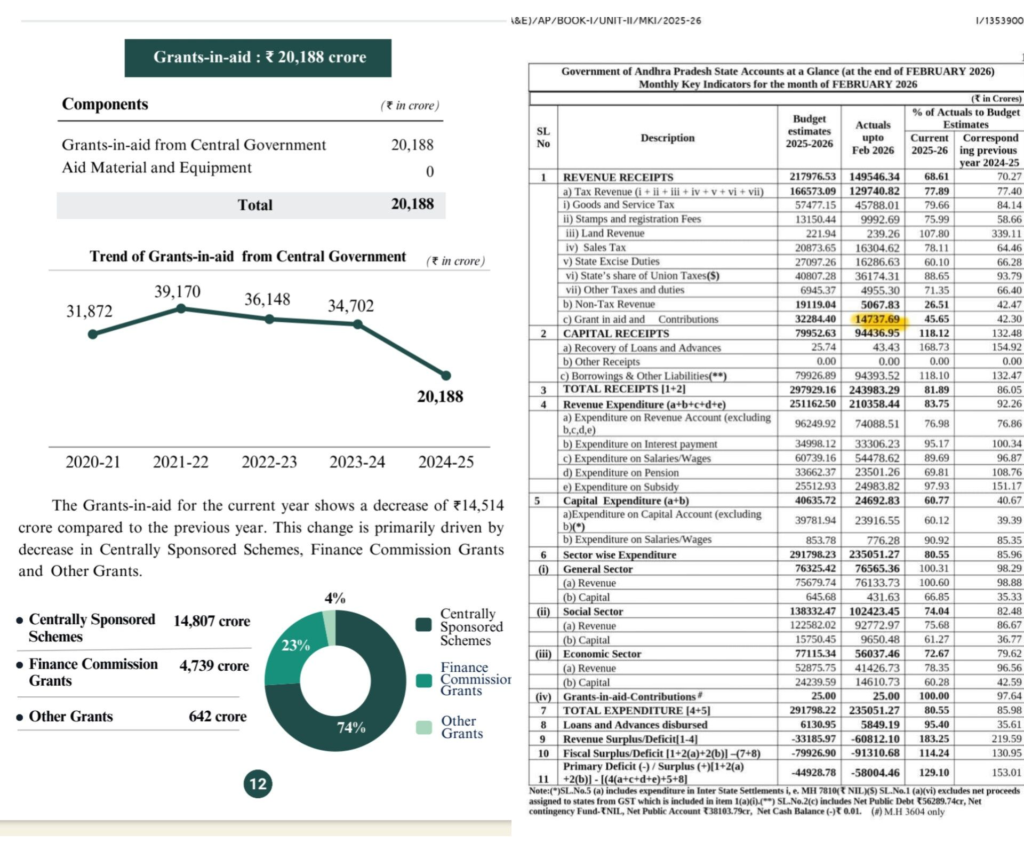 ఆంధ్రప్రదేశ్‌కు కేంద్ర ప్రభుత్వం నుంచి వచ్చే Grants-in-Aid నిధుల విషయంలో ఆశ్చర్యకరమైన మార్పులు కనిపిస్తున్నాయి. ఒక వైపు గత ప్రభుత్వ కాలంలో భారీగా నిధులు రాగా, మరో వైపు ప్రస్తుత పరిస్థితుల్లో అవి గణనీయంగా తగ్గినట్టు కనిపిస్తోంది. ఈ తేడా కేవలం సంఖ్యలలోనే కాదు, పాలన విధానంలో కూడా స్పష్టంగా కనిపిస్తోంది.