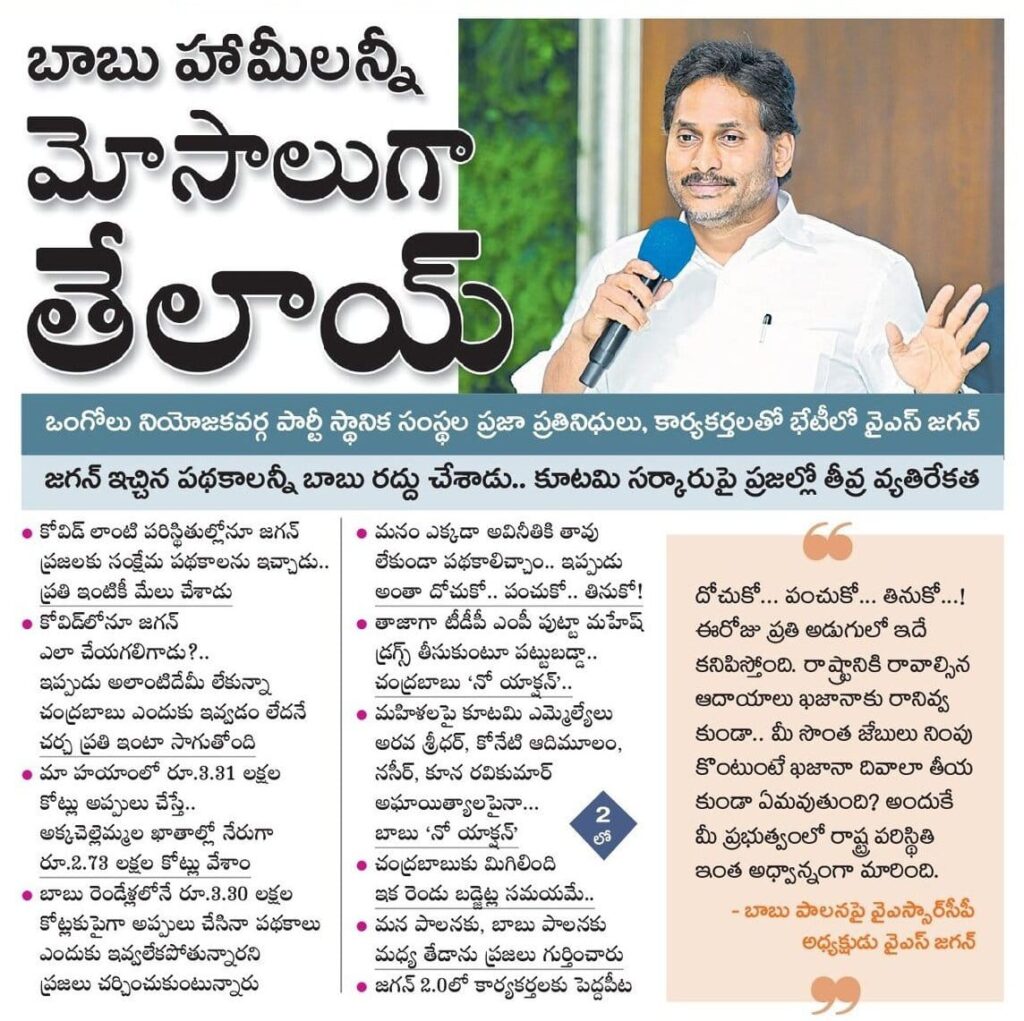 ఒంగోలు నియోజకవర్గంలో కార్యకర్తలతో జరిగిన సమావేశంలో వైఎస్ జగన్ మోహన్ రెడ్డి చంద్రబాబు నాయుడు ప్రభుత్వంపై తీవ్ర స్థాయిలో విరుచుకుపడ్డారు. ఇచ్చిన హామీలు అమలు చేయకుండా ప్రజలను మోసం చేస్తున్నారని ఆరోపించారు. సంక్షేమ పథకాల రద్దు, పెరుగుతున్న అప్పులు, అవినీతి ఆరోపణలు, చర్యల లోపం వంటి అంశాలను ప్రస్తావిస్తూ ప్రభుత్వ వైఫల్యాలను ఎత్తిచూపారు.