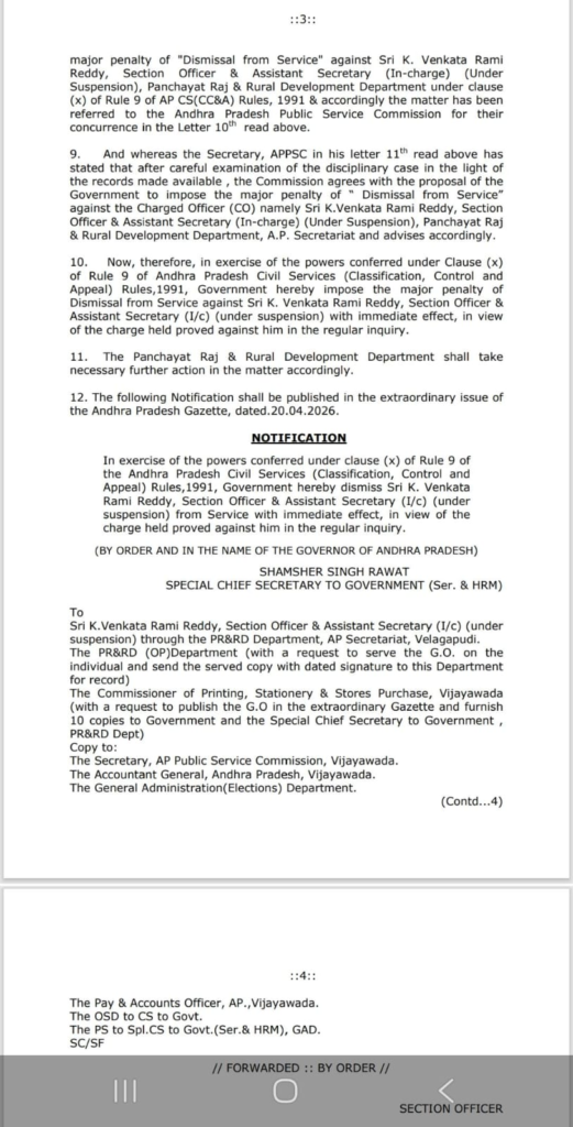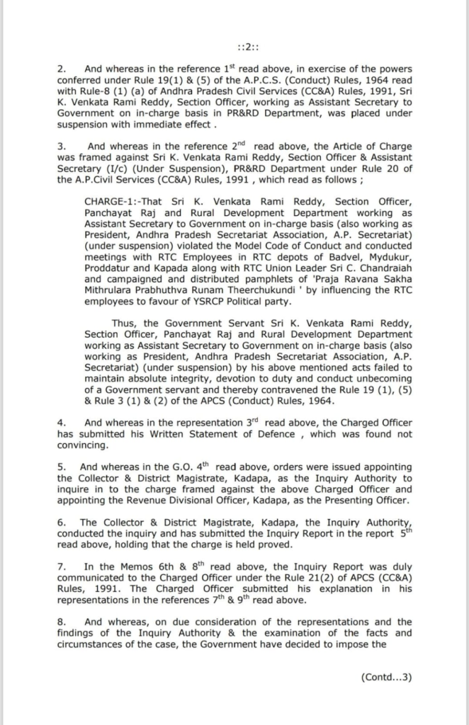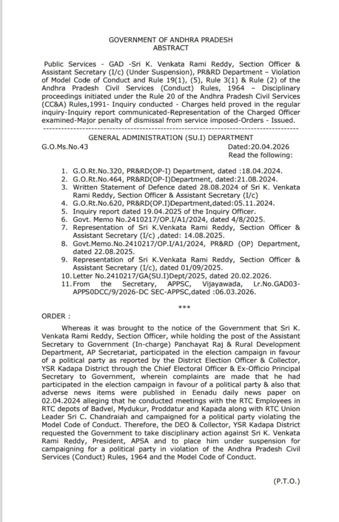 ఆంధ్రప్రదేశ్‌లో మరోసారి ఉద్యోగుల సమస్యలు, ప్రభుత్వ నిర్ణయాలు చర్చనీయాంశంగా మారాయి. ఏపీ సెక్రెటరియేట్ ఉద్యోగుల సంఘం మాజీ అధ్యక్షుడు కాకర్ల వెంకట్రామిరెడ్డిని ఉద్యోగం నుంచి డిస్మిస్ చేస్తూ ప్రభుత్వం ఉత్తర్వులు జారీ చేయడం రాజకీయంగా, పరిపాలనా వర్గాల్లో తీవ్ర చర్చకు దారితీసింది.
