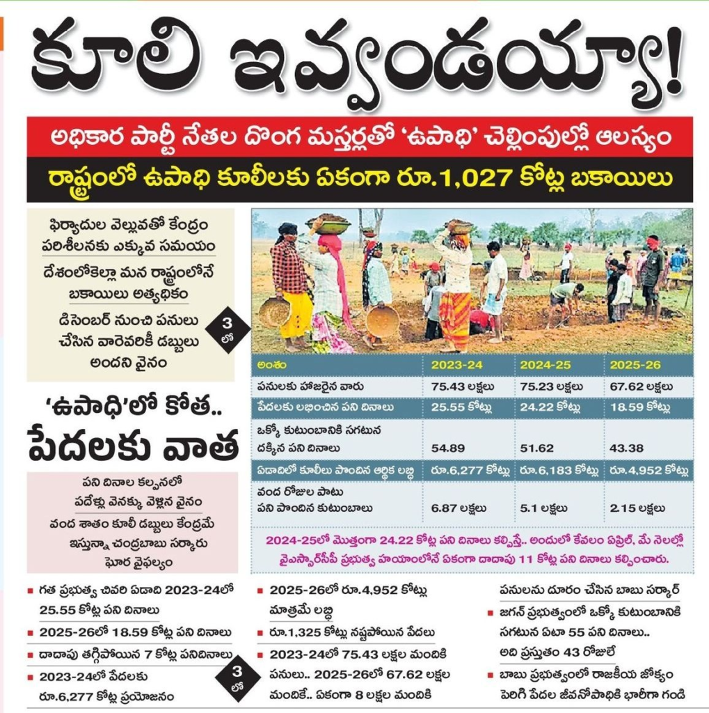 - రాష్ట్రంలో ఉపాధి కూలీలకు ₹1,027 కోట్ల బకాయిలు