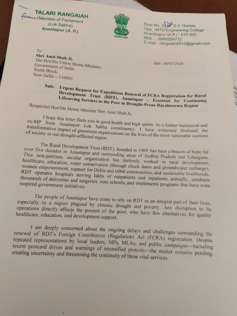 RDT సంస్థకు విదేశీ నిధుల అనుమతులు నిలిచిపోయిన సమయంలో వేలాది మంది అనాథలు, రైతులు, విద్యార్థుల భవిష్యత్తు అంధకారంలోకి వెళ్లే పరిస్థితి ఏర్పడింది.