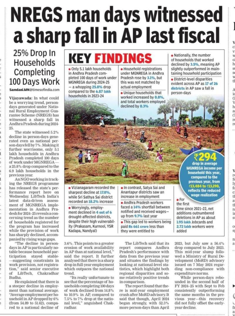 ఆంధ్రప్రదేశ్‌లో గ్రామీణ ఆర్థిక వ్యవస్థపై ఆందోళనలు రోజురోజుకు పెరుగుతున్నాయి. ముఖ్యంగా గ్రామీణ ఉపాధికి ప్రధాన ఆధారమైన ఎమ్‌జీఎన్‌ఆర్‌ఈజీఏ (MGNREGA) అమలు గత రెండు సంవత్సరాల్లో గణనీయంగా తగ్గిందనే విషయాన్ని అధికారిక గణాంకాలే చెబుతున్నాయి.