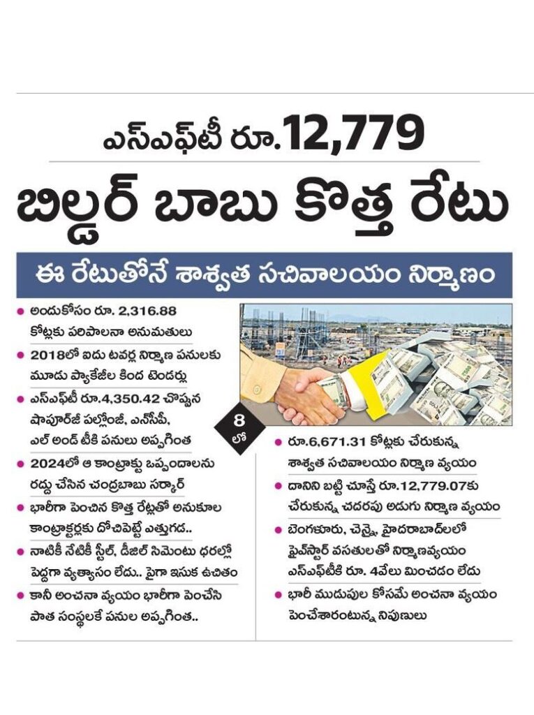శాశ్వత సచివాలయం నిర్మాణం పేరుతో రాష్ట్ర ఖజానాపై భారీ భారం పడినట్టు ఆరోపణలు వెల్లువెత్తుతున్నాయి. చదరపు అడుగుకు రూ.12,779 వరకు నిర్మాణ వ్యయం పెరగడం, మొదట ఇచ్చిన అంచనాలను మించి ఖర్చులు భారీగా పెరగడం అనేక అనుమానాలకు తావిస్తోంది. ముఖ్యంగా ఇతర రాష్ట్రాలతో పోలిస్తే ఇక్కడ ఖర్చులు అసాధారణంగా అధికంగా ఉండడం ఇప్పుడు పెద్ద వివాదంగా మారింది.