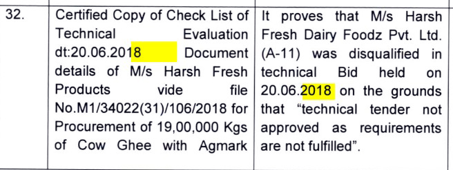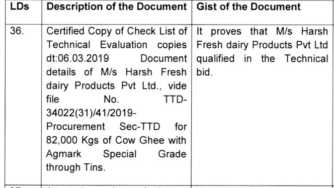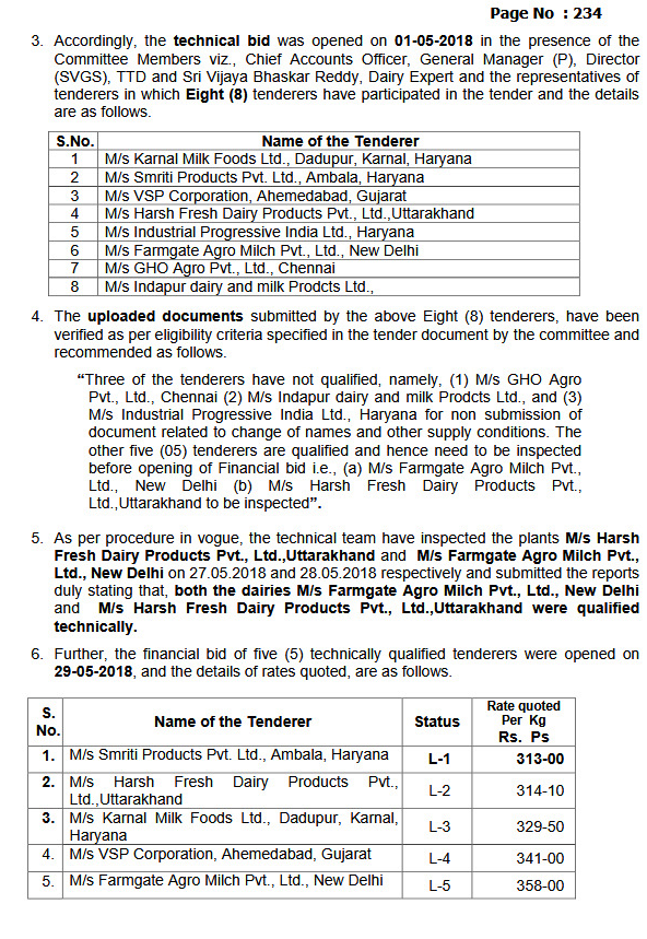 - 06 మార్చి 2019న భోలే బాబా డెయిరీకి 82,000 కేజీల నెయ్యి సరఫరాకు టిన్నుల ద్వారా టెండర్ ఇచ్చారు.