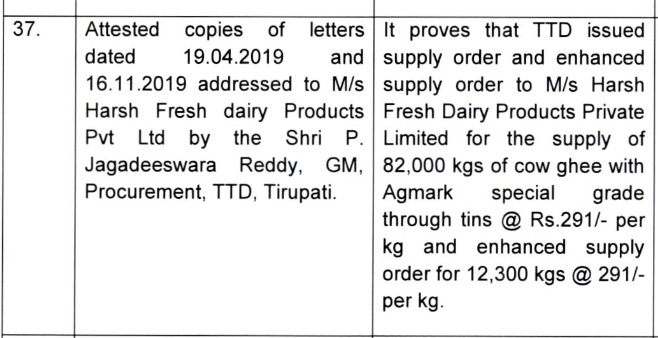 - 19 ఏప్రిల్ 2019న ఇప్పటికే ఇచ్చిన 82,000 కేజీలతో పాటు మరో 12,300 కేజీల నెయ్యి సరఫరాకు అదనపు ఆర్డర్ కూడా ఇచ్చారు.