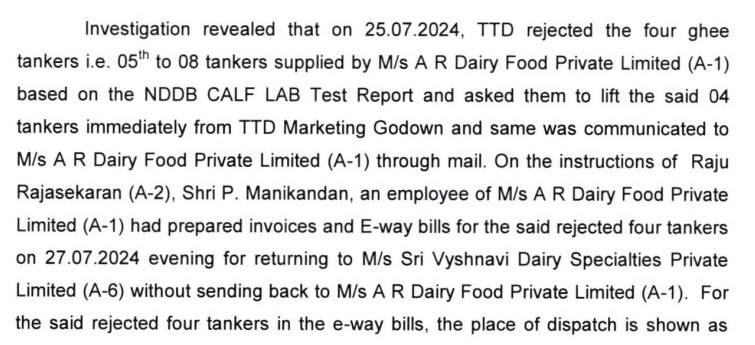 - ఆ నాలుగు నెయ్యి ట్యాంకర్లను 25 జులై 2024న టీటీడీ గోదాం నుంచి వెనక్కి పంపినట్టు, 05 మే 2025న దాఖలైన మొదటి చార్జ్షీట్లో సీబీఐ–సిట్ స్పష్టంగా పేర్కొంది.
