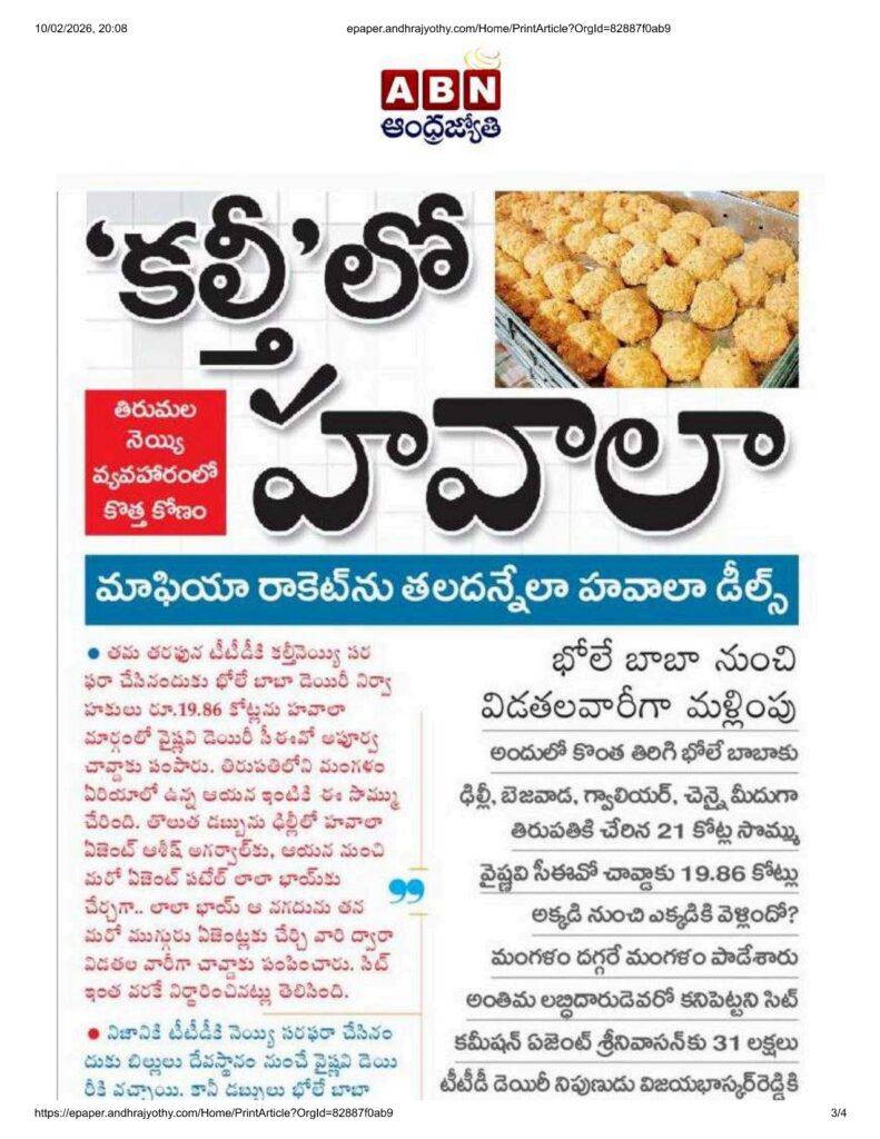 - వెనక్కి పంపిన నాలుగు నెయ్యి ట్యాంకర్లు మళ్లీ టీటీడీకి వచ్చి, వాటిని లడ్డూ ప్రసాదంలో ఉపయోగించినట్టు **23-01-2026న దాఖలైన SIT Final Supplementary Charge Sheet (పేజీ 44)**లో స్పష్టంగా పేర్కొన్నారు.