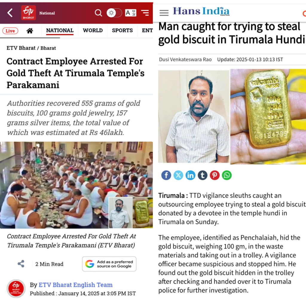 తిరుమల తిరుపతి దేవస్థానం (టీటీడీ)లో భక్తులు సమర్పించే హుండీ కానుకల భద్రతపై మరోసారి ప్రశ్నలు తలెత్తుతున్నాయి. తిరుమల పరాకామణిలో బంగారు బిస్కెట్లు మరియు ఆభరణాలను దొంగతనం చేయడానికి ప్రయత్నించిన ఘటన వెలుగులోకి రావడంతో పెద్ద ఎత్తున చర్చ జరుగుతోంది. ఈ ఘటనలో ఒక కాంట్రాక్ట్ ఉద్యోగిని అధికారులు అరెస్ట్ చేసినట్లు సమాచారం.