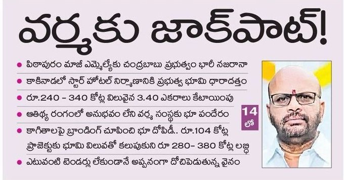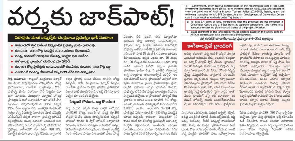 పిఠాపురం మాజీ ఎమ్మెల్యే వర్మకు అనూహ్యంగా లభించిన భూకేటాయింపు ఇప్పుడు పెద్ద వివాదంగా మారింది. కాకినాడలో కన్వెన్షన్ సెంటర్, 5-స్టార్ హోటల్ పేరుతో విలువైన ప్రభుత్వ భూమిని కేటాయించడం వెనుక భారీ ప్రయోజనాలు ఉన్నాయన్న ఆరోపణలు వెల్లువెత్తుతున్నాయి.